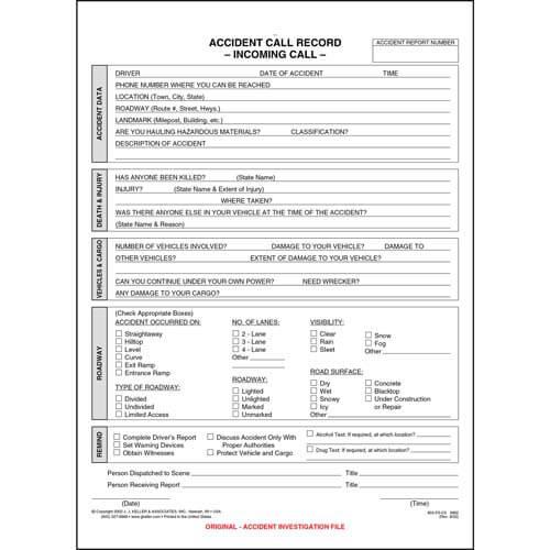 This Accident Call Record form is a 2-Part Carbonless form. This form is designed to collect all pertinent information that is required by the dispatcher when it comes to accidents or incidents.