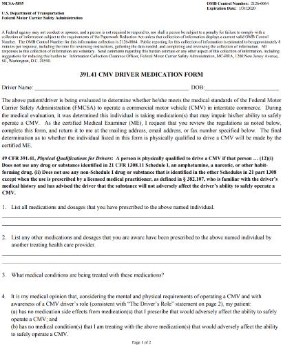 This MCSA-5895 CMV Driver Medication Form is required per 391.41 CFR regulations. This form requests additional information regarding medications prescribed by the treating physician as an optional tool for Medical Examiners to use in determining if a driver is medically qualified under 49 CFR 391.41.