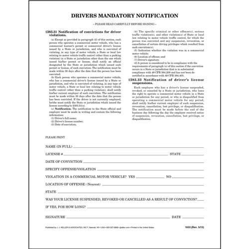 This Driver's Mandatory Notification is a single ply form. This form helps to satisfy Part 383.33 of the Federal Motor Carrier Safety Regulations. Measures 8.5" x 11".