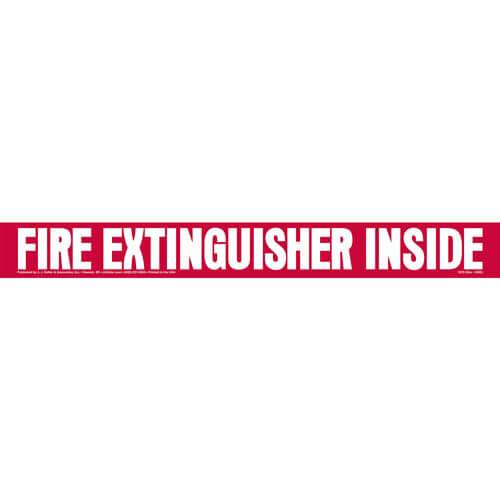 This Fire Extinguisher Inside Decal measures 18" x 2", and is printed on durable UV protected exterior grade vinyl with adhesive backing. This decal is designed to be used on commercial vehicles, but can be used for most any application. This bright red decal boats white lettering to show drivers where to locate a fire extinguisher in case of a fire, or an accident.