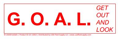 This Get Out and Look G.O.A.L. decal is designed to be placed on your vehicles windows, windshield, dashboard, or on the edge of an exterior mirror. This bright and friendly reminder will inform your drivers of the importance of getting out of the vehicle before backing up to check for any obstacles or pedestrians. This clear window decal may save you from damages, and your insurance company will definitely approve.