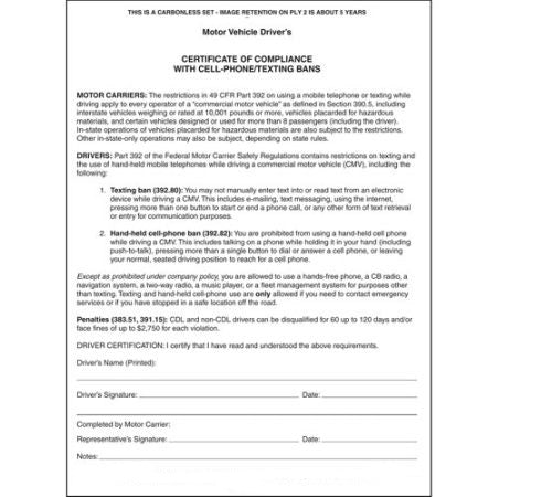 Motor Vehicle Cell Phone Call and Text Ban Certificate of Compliance