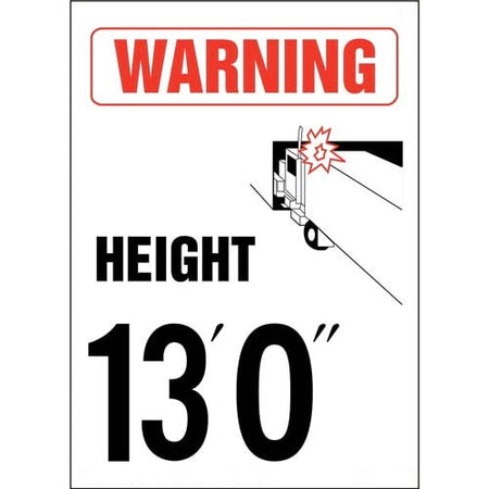 This Warning, Vehicle Height 13' 0" decal measures 7" x 10" and is printed on exterior grade laminated vinyl with permanent adhesive backing.