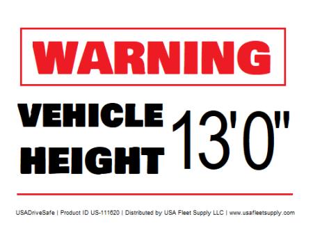 This 5" x 3" Warning Vehicle Height 13’ 0” decal is printed on premium 4mil exterior grade vinyl with adhesive backing. This durable vinyl decal is weatherproof with bright, highly visible outline and text that is coated by a glossy UV protecting clear finish to prevent fading over time.